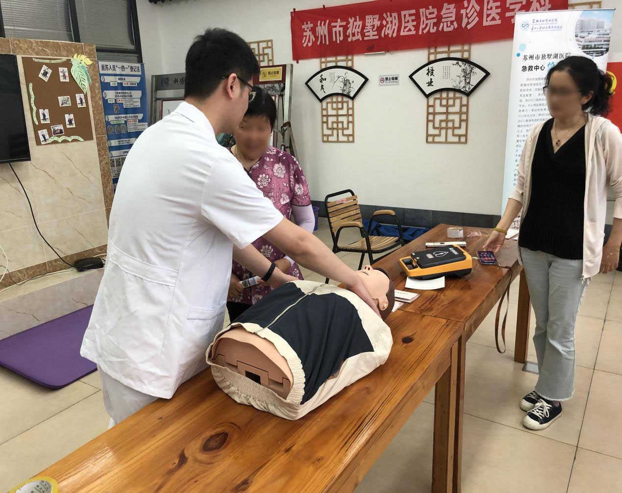 5月25日,我院急诊医学科医护人员前往东方文荟苑社区,为社区居民开展“心肺复苏的家庭自救及海姆利克急救法”的培训。此次培训,社区百姓们不光听懂了理论知识,还熟悉了实际操作。深入了解了CPR及海姆利克急救法,作为拓展,医护人员还介绍了自动体外除颤器(AED)的使用,并仔细演示了操作流程。