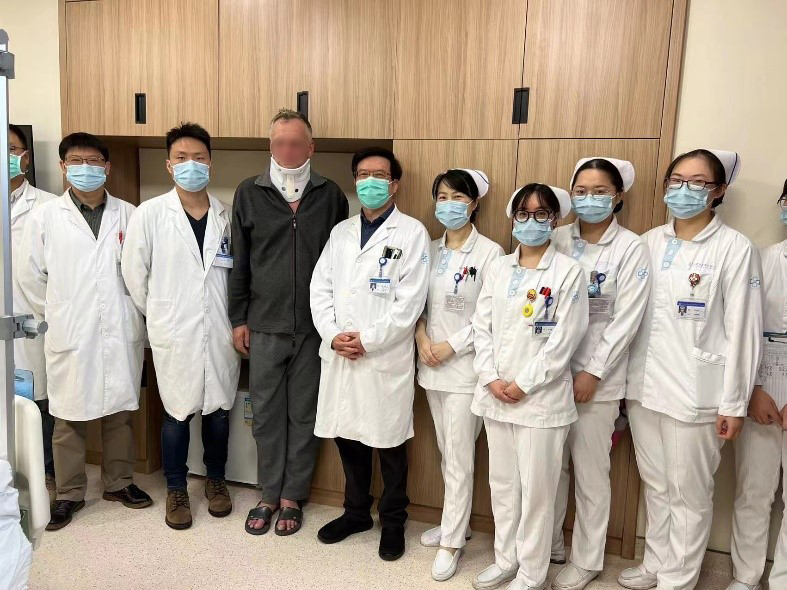 就这样,2022年3月,Hester办理了住院手续,在进一步的详细评估后,姜主任制定了经前路减压融合术的手术方案。与后路椎管扩大成型术相比较,具有创伤小、直接减压与恢复快的优点。但由于Hester颈椎的先天畸形与严重的骨质增生,手术难度却增加了很多。手术当天,在麻醉科医生黎鹏与手术室护士的密切配合下,姜为民主任带领王喜安副主任和赵星毅博士,经过两个多小时的精雕细琢,将增生的骨赘在狭窄变形的椎间隙里一一切除,解放了受压的脊髓,完成了这台特殊的“颈椎前路椎间盘切除+椎间融合术”。Hester在术后第一天就激动地告诉姜主任:“Right after the surgery I found the balance problem was gone. I can stand again on one leg without crashing on the floor now and the numbness in the finger is reduced.”(我右手持续了3年之久的麻木感已经明显缓解,佩戴颈托后试着下床行走,发现术前那种失去平衡的症状不见了,甚至单足站立也不怕摔倒)。