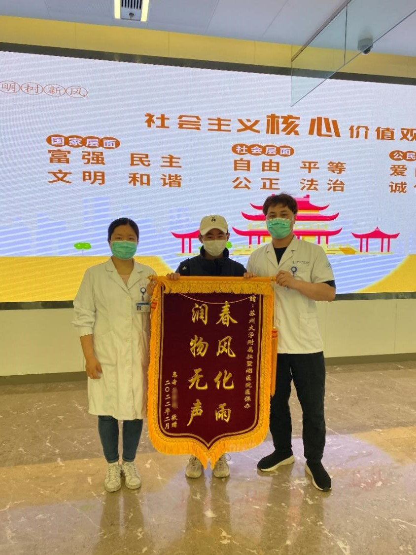 2022年6月1日上午,患者苏先生将一面印有“春风化雨,润物无声”的锦旗送到了苏州大学附属独墅湖医院的医保办公室,对我院的医保服务表示感谢。