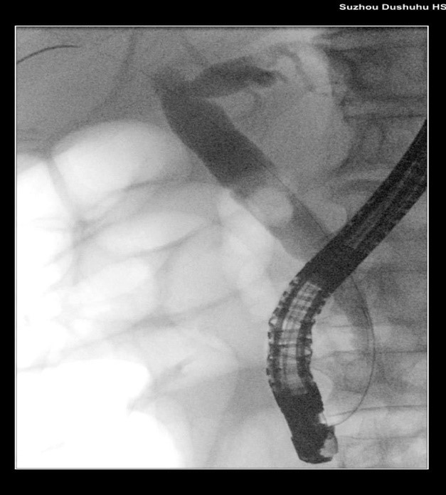苏大附四院ERCP团队在手术中看到陈大爷的胆总管在结石的影响下已经宽达13mm,结石大小11*10mm,将十二指肠乳头切开并扩张后用取石球囊把结石取出,置入胆管支架使胆汁充分引流,顺利解除了胆道梗阻。