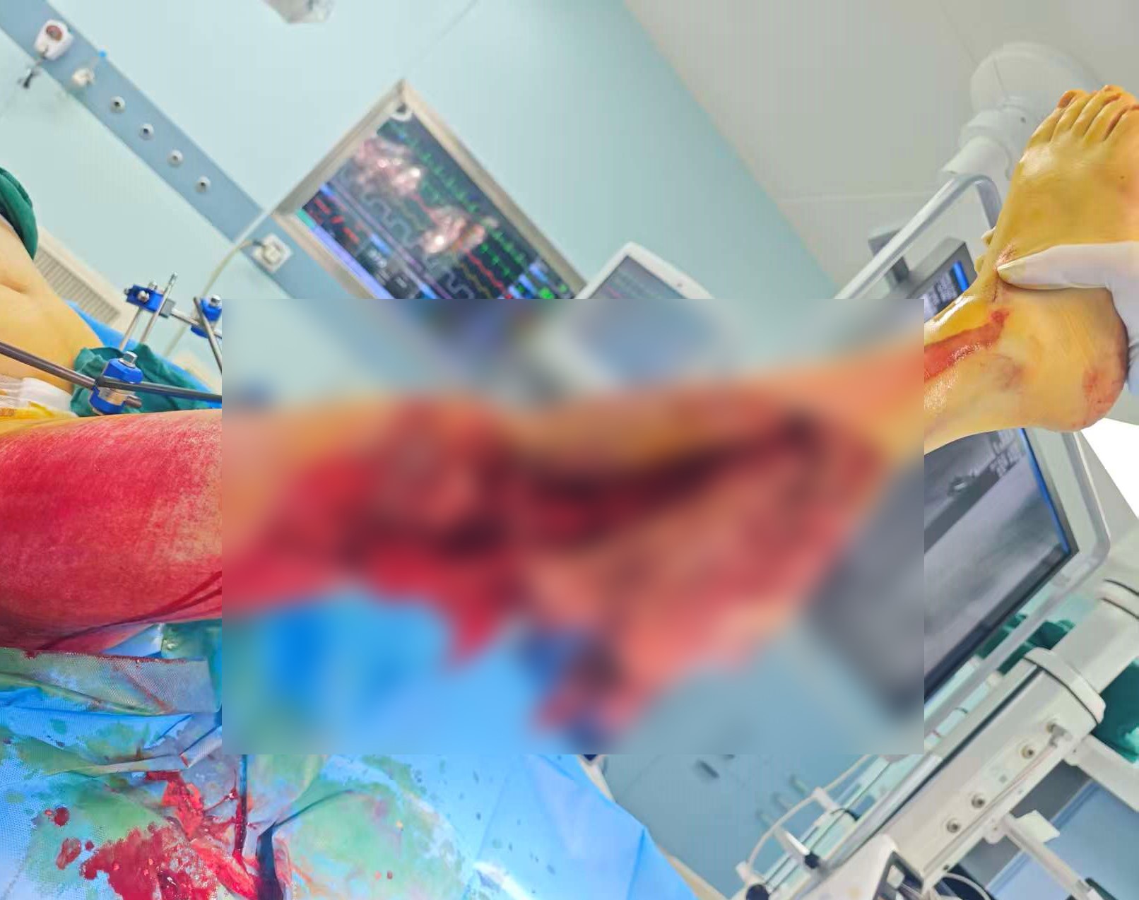 手术室内,无影灯的光芒彻夜未熄,医护人员通力协作,精密配合。血管介入科团队率先登场,在DSA设备的精准引导下,将栓塞剂准确送入髂内血管,成功阻断了致命性出血,为后续手术筑牢“安全防线”;紧接着,骨科团队迅速为患者实施骨盆外固定架植入术,凭借精湛技术将移位的骨骼临时固定,为后续操作筑牢稳定“基座”;随后,整形科团队接过“接力棒”,专注于下肢血运重建——在患者患肢处小心翼翼游离出约20厘米长的大隐静脉,如同拆解精密仪器般将其精准分成两段,分别桥接断裂的腘动脉与腘静脉,又以毫米级的精度细致吻合胫前动脉,为缺血的下肢重新搭建起“生命通道”。同时,医生们手持镊子逐寸清理无血运的肌肉组织与撕脱皮肤,每一次下刀、每一次缝合,都凝聚着对生命的敬畏与专业的严谨。
