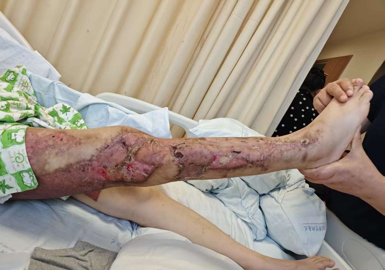 在此后的治疗中,患者又先后经历7次扩创、皮瓣转移与植皮术。在医护团队的精心呵护与多科室的持续协作下,患者病情逐步稳定,不仅成功挣脱了死神的纠缠,那只曾被判定“几乎不可能保住”的右小腿,也奇迹般得以留存。
