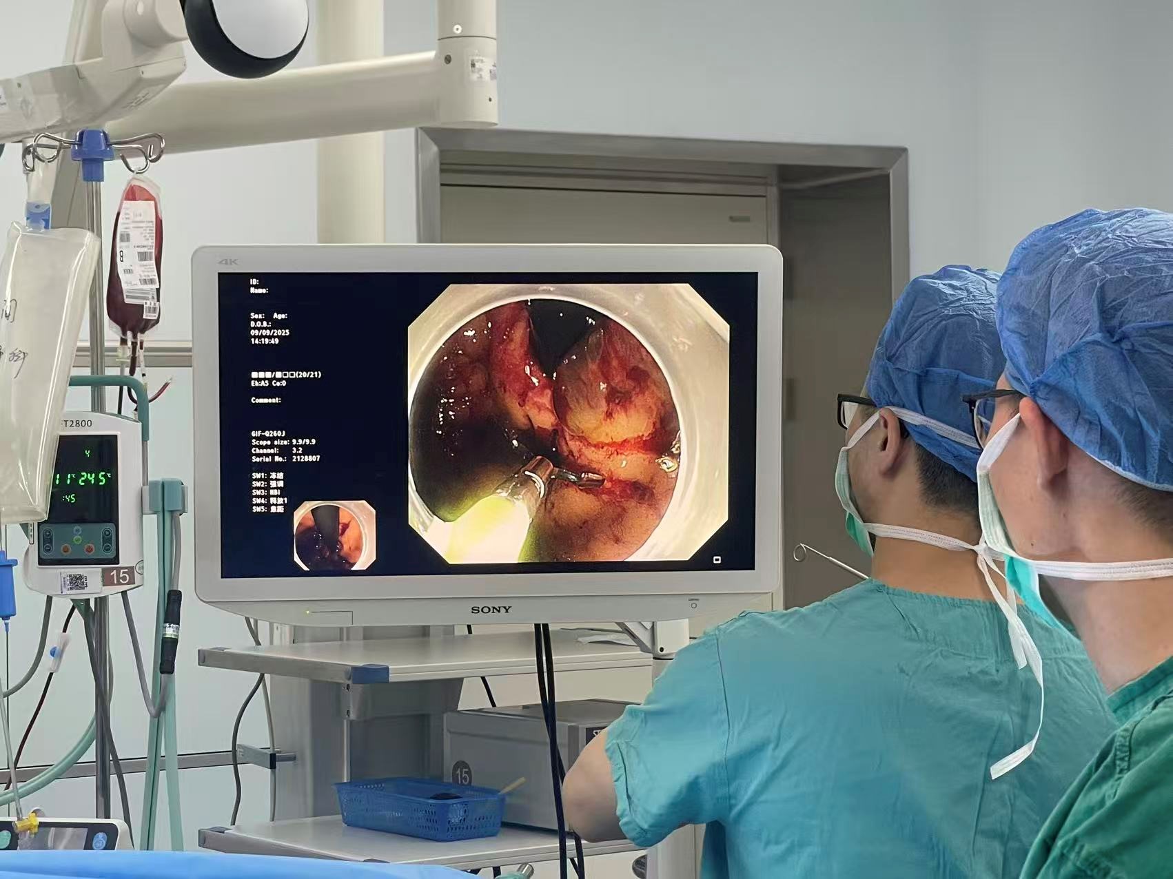 然而,考验接踵而至。韩阿姨突然出现致命的消化道大出血,口鼻和胃肠道不断涌出鲜血,血压难以维持。EICU迅速组织多学科会诊。消化内科医师团队立即施行急诊胃镜,发现了胃小弯侧存在的破口,危急时刻,普外科时林森副主任医师火速驰援,与家属沟通确认后,在ECMO支持下的极高风险中为患者进行胃穿孔修补术。术中清理血凝块达2000ml!术后第二天,患者血压再次持续下降,口鼻和胃肠减压管涌出了大量血液。耳鼻喉科医师在成功压迫患者口腔活动性出血点后,消化内科再次行急诊胃镜,并成功止血。随后,呼吸与危重症医学科曾大雄主任医师团队为患者进行纤支镜检查,吸取了堵塞韩阿姨呼吸道的大量脓痰。