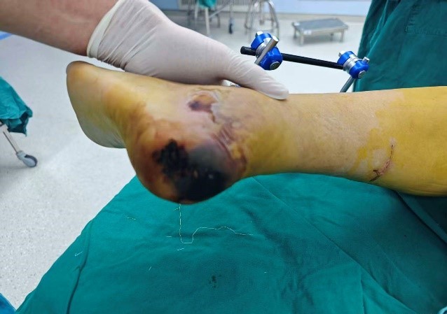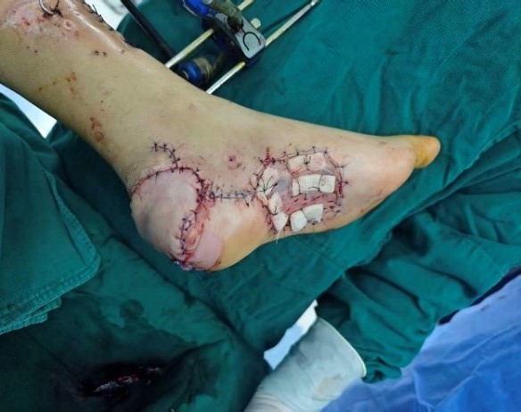 近日,一位中年女性因车祸致全身多发损伤,包括颅内出血、四肢多发骨折、左足跟后部皮肤坏死及左侧胫腓骨下段骨折。我院神经外科与骨科携手先行处理颅内出血、骨折等关键损伤,患者生命体征平稳后转至整形外科治疗左足跟部的坏死创面。