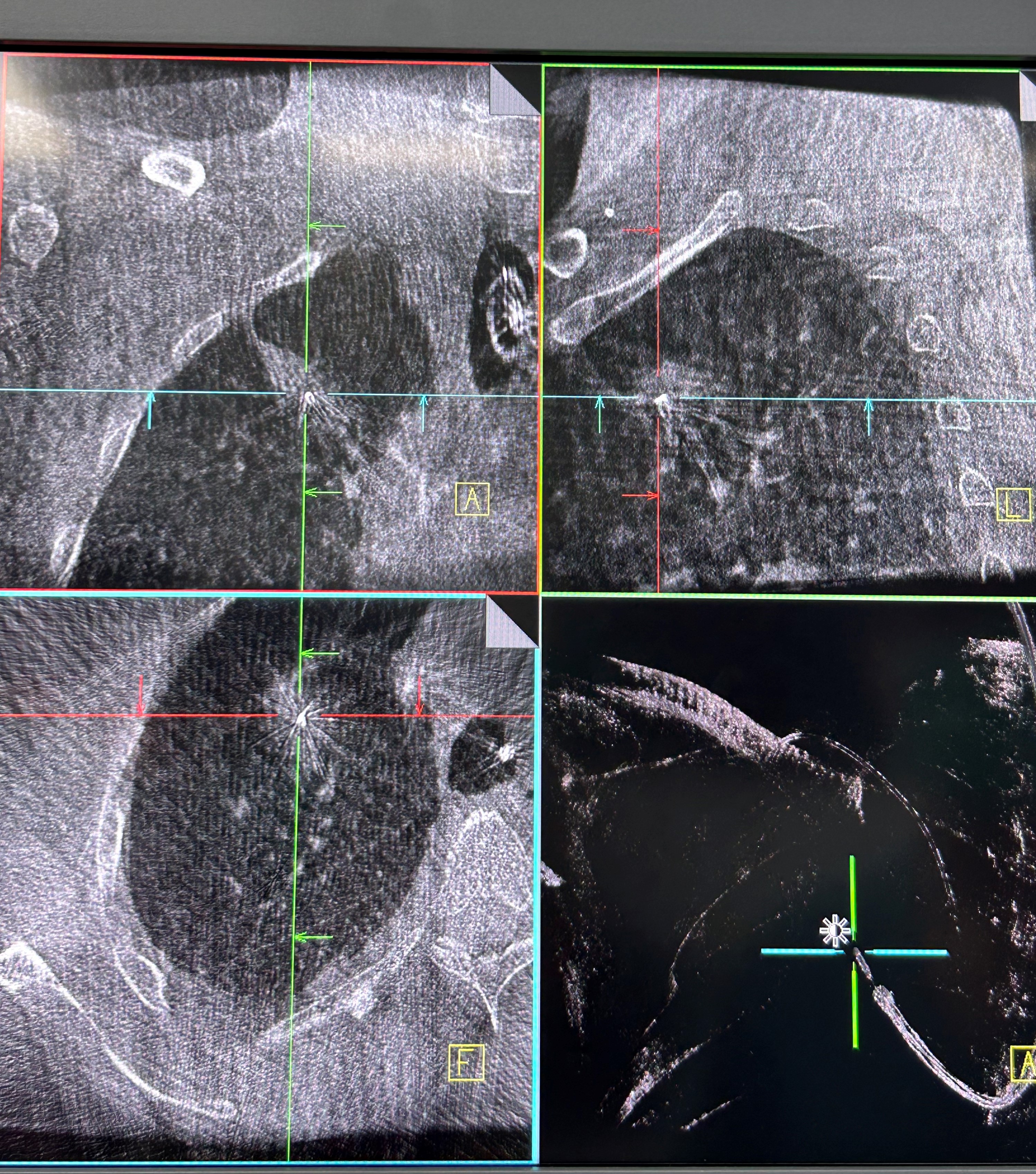 手术当日,呼吸科团队帮助患者在全麻下完成气管插管,手术由蒋军红主任指导,负责手术方案的实时优化与安全保障。曾大雄主任医师和王兰主任医师精准操作机器人支气管镜,在支气管镜导航机器人的精准引导下,通过AI三维重建、智能路径规划以及多模态信息融合,将支气管镜精准“引导”至右上叶尖段病灶处。随后,团队启动CBCT(锥形束计算机断层扫描)通过实时影像复核确认靶病灶,实现病灶“毫米级”精准锁定,彻底解决肺部病灶“找不到、找不准”的核心难题。机器人气管镜导航技术实现了从术前规划到术中操作全流程的智能精准控制,真正做到了肺部病灶的精准覆盖。