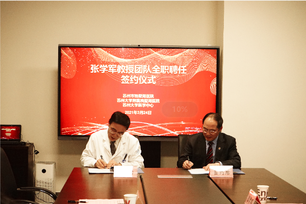 今天(3月24日)下午,我院举行张学军教授团队全职聘任签约仪式,园区社会事业局副局长姚青,苏州市独墅湖医院(苏州大学附属独墅湖医院)党委书记、院长侯建全,党委副书记、纪委书记洪建娣,党政综合办主任傅强等出席仪式。会议由洪建娣书记主持。