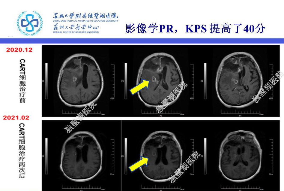 近期,在苏州市独墅湖医院(苏州大学附属独墅湖医院)神经外科在最近的临床试验中,也取得了重大突破。患者王女士,于2020年8月20号行脑胶质瘤左额叶恶性肿瘤切除术,胶质瘤3级。术后1月发现左额叶肿瘤复发。行放疗后症状加重,11月9号患者神志朦胧,左侧肢体刺痛无反应。再次手术切除大部分肿瘤后植入omaya囊,之后11月30号开始cart细胞治疗,12月2号进行第二次治疗。之后患者症状逐渐好转,于今年1月和2月分别再次进行cart细胞治疗,目前神志清醒,可自行下地活动。