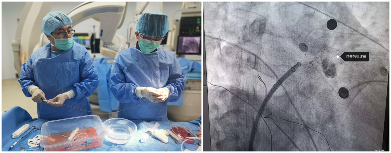 (植入前准备) (植入后,封堵器呈草莓状,封堵完全,无残余分流)