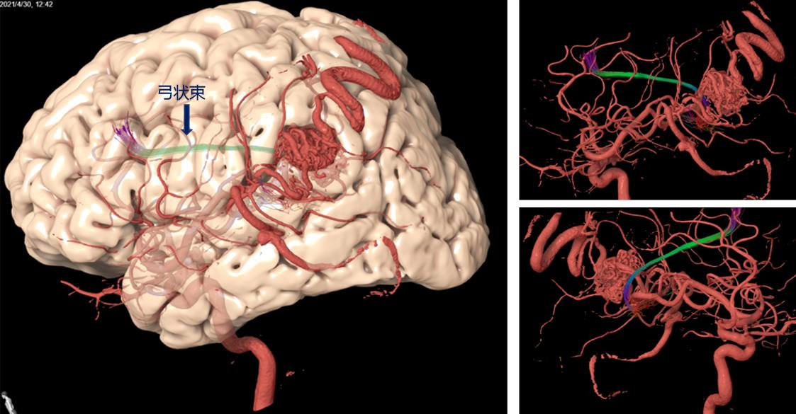 术前经科室讨论,决定使用最新的神经导航将患者头颅MRI及DSA造影结果进行多模态融合,以便直观地观察畸形血管团与Wernicke区及传导语言功能的纤维束(弓状束)的关系。