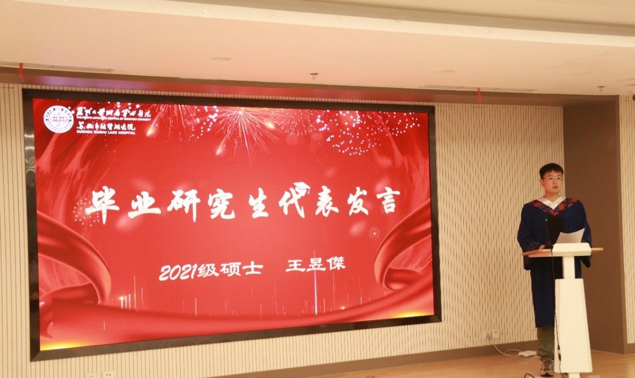 随后,毕业生代表王昱傑同学上台发言,他分享了自己在附四院求学的感悟和收获。他表示,在附四院的学习经历不仅让他们获得了宝贵的医学知识,更让他们学会了如何面对困难和挑战,如何成为一个有责任、有担当的医学工作者。
