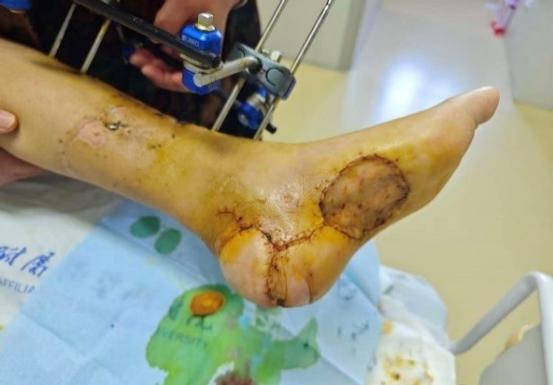 近日,一位中年女性因车祸致全身多发损伤,包括颅内出血、四肢多发骨折、左足跟后部皮肤坏死及左侧胫腓骨下段骨折。我院神经外科与骨科携手先行处理颅内出血、骨折等关键损伤,患者生命体征平稳后转至整形外科治疗左足跟部的坏死创面。