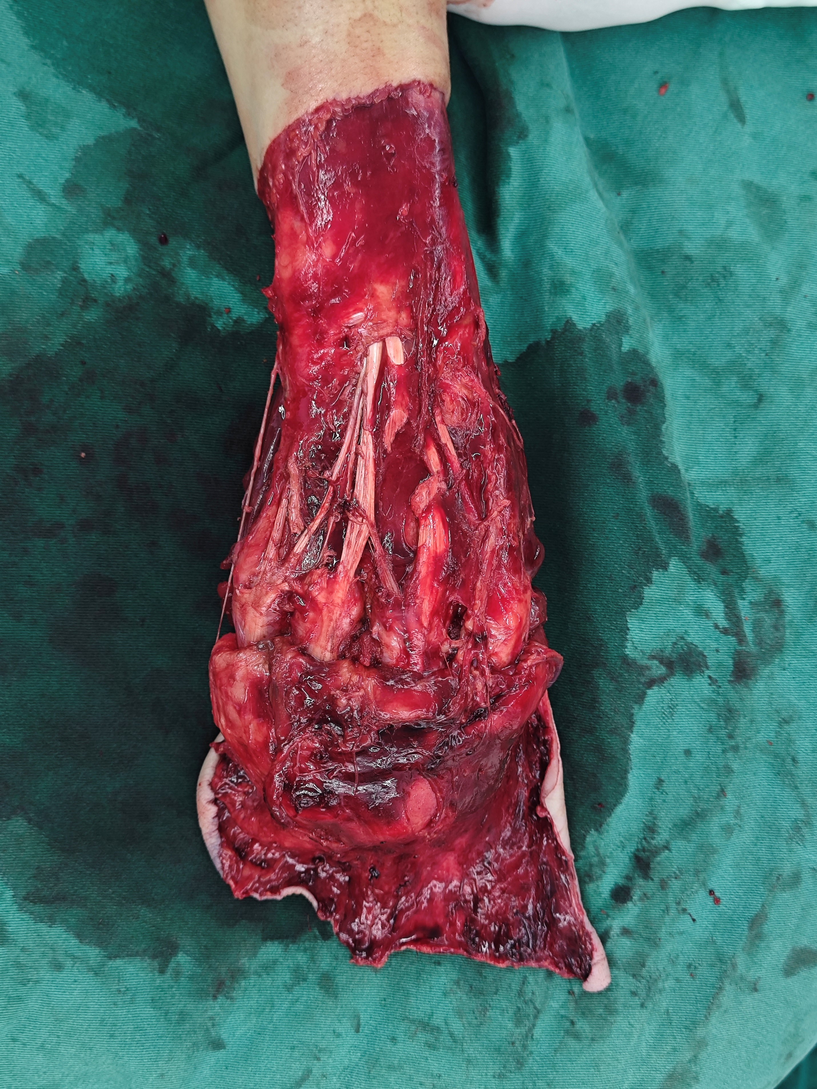 患者入院后,整形外科第一时间进行会诊。考虑到伤情危急且复杂,由沈国良主任医师和张建超副主任医师紧急组织召开病情讨论会。在讨论中沈国良主任医师重点指出,患者皮肤脱套范围广、组织挫伤重,还伴随骨折和肌腱损伤,若处理不当,不仅可能面临组织坏死、截肢风险,还会严重影响后续手部功能。经过对患者伤情的全面评估和反复研讨,团队最终达成一致:决定为患者实施脱套组织原位显微再植术,尽可能保留“原装”组织以及恢复手部外形与功能。