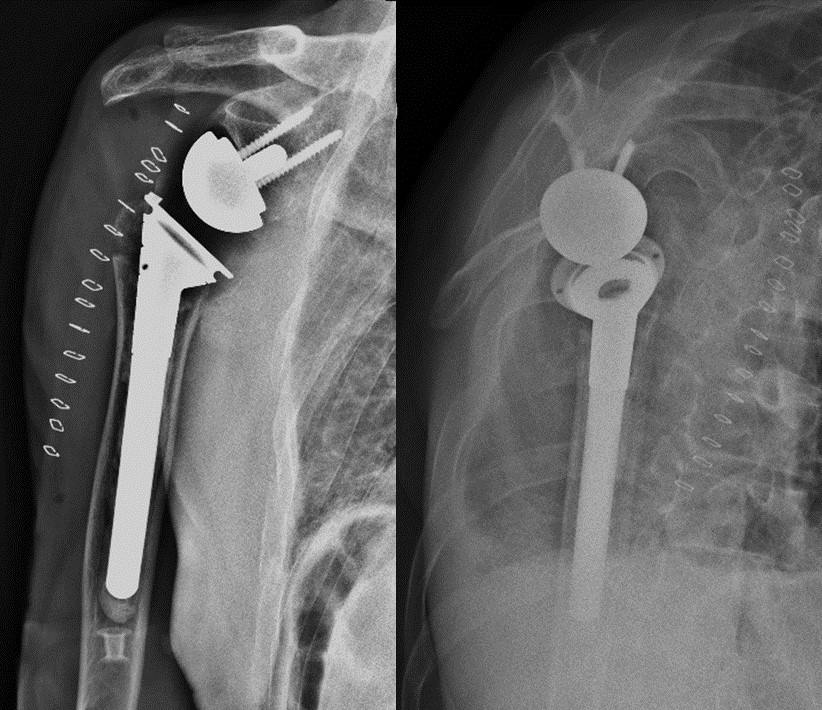 在麻醉手术科、输血科等科室的全力配合下,王亮副主任医师团队顺利取出骨折块,精确处理大小结节,安装关节假体,重建了肩关节的稳定性,整个手术过程顺利。术后复查X线提示假体位置良好,关节对位满意。