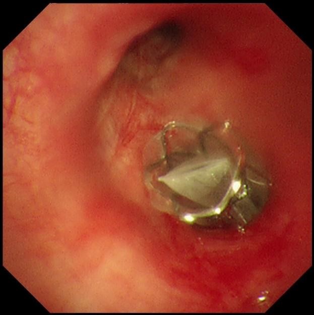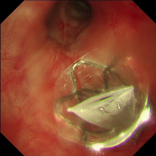 手术当天,蒋军红主任和曾大雄主任密切配合,用时30分钟便顺利完成手术。手术通过微创支气管镜介入,在高清内镜视野下,精准定位病变最严重的靶肺叶支气管,精准植入一枚微型支气管内活瓣(EBV-TS-5.5),术中实时验证活瓣开合状态良好,通气单向引流功能正常。